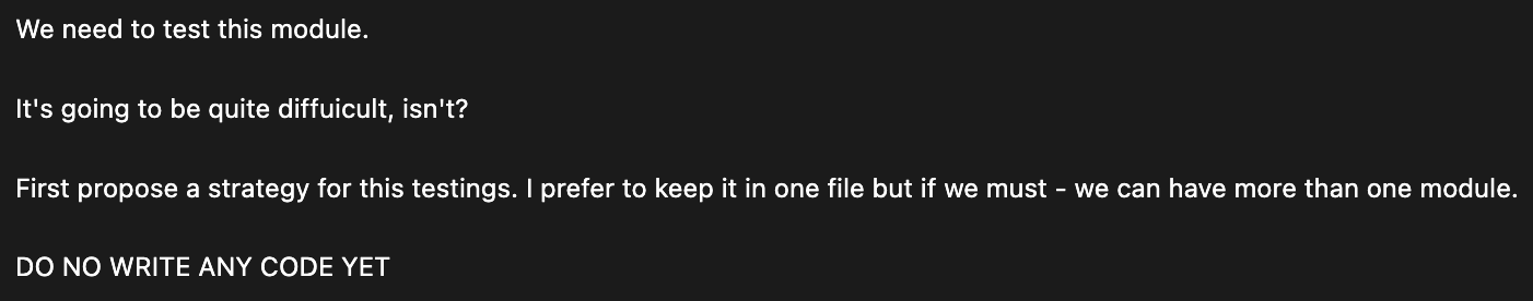 What followed looked like a well-structured plan for testing: starting with configuration, then moving through functions one by one. But when I ran the tests, almost all failures stemmed from the test code itself—not the actual code. The LLM had made incorrect assumptions about class structures, function signatures, and internal logic.